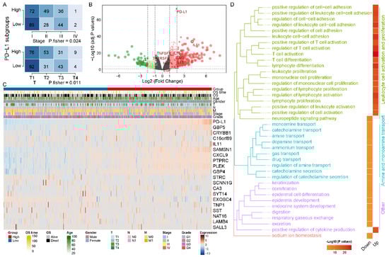 Different molecular characteristics betweenand subgroups. (A) The distribution of pathological stage and T among PD-L1 subgroups was significantly different. (B) The volcano plot demonstrated differences in gene expression levels, particularly for cytokines. (C) The heatmap charted the expression levels of TOP10 DEGs in the and subgroups, respectively. (D) TOP 20 biological processes in GO summary of DEGs in PD-L1 subgroups. GO biological processes are grouped according to the functional theme and plotted for PD-L1 subgroups.