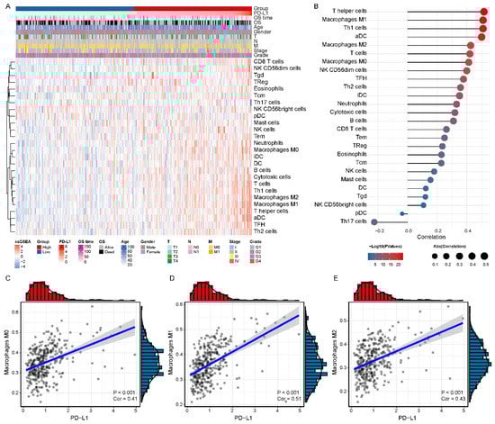 To investigate the immune cell subpopulations that may correlate with PD-L1, We first assessed the infiltration level of each immune cell in the HCC microenvironment by using ssGSEA analysis (Figure 3A). Then, we calculated the association between the expression level of PD-L1 and the infiltration level of immune cells in HCC and identified seven PD-L1-associated immune cell subpopulations in the TCGA LIHC cohort (p value < 0.05 and cor > 0.4) (Figure 3B and Table S2). In particular, PD-L1 expression was positively correlated with the infiltration level of macrophages M0 (cor = 0.413, p value < 0.001), macrophages M1 (cor = 0.509, p value < 0.001) and M2 (cor = 0.426, p value < 0.001) (Figure 3C–E). In addition, all the above results were verified in the GSE62232 validation cohort (Figure S1A,B), especially with macrophages M1 (cor = 0.718, p value < 0.001) and M2 (cor = 0.601, p value < 0.001) (Figure S1C–E and Table S2). The above results indicated that PD-L1 was positively correlated with the infiltration of macrophages in HCC, which may be an important source of enhanced immunosuppression.
