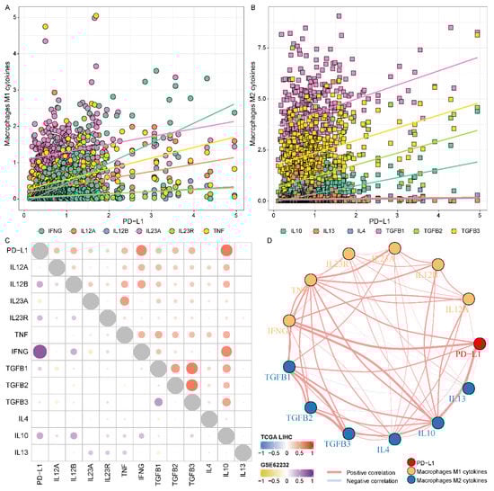 To further elaborate on the association between PD-L1 and macrophages, we further analyzed the correlation of PD-L1 with macrophage markers, especially inflammatory response-related macrophage cytokines. The results revealed that macrophages M1-related cytokines (IL12A, IL-12B, IL23A, IL23R, TNF, and IFNG) (Figure 4A and Table S3) and macrophages M2-related cytokines (TGFB1, TGFB2, TGFB3 and IL10) (Figure 4B and Table S3) were positively correlated with PD-L1 in the TCGA LIHC cohort (p value < 0.001). Notably, macrophages M1 cytokine IFNG displayed a robust positive correlation with PD-L1 (cor = 0.617, p value < 0.001), and macrophages M2 cytokine IL10 displayed a robust positive correlation with PD-L1 (cor = 0.677, p value < 0.001). We also observed that most of the PD-L1 macrophages M1 and M2 cytokines showed a positive correlation with each other (Figure 4C). The analysis of the GSE62232 validation cohort also presented similar results (Figure 4C and Table S3). We also constructed a protein–protein interaction network of PD-L1 and cytokines using STRING, and multiple potential interactions were displayed between the PD-L1 and cytokines (Figure 4D and Table S4). These findings supported that PD-L1 was intimately and positively correlated with macrophages M1 and M2 and the cytokines enhanced the polarization of TAMs in an HCC microenvironment.