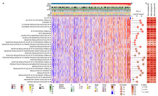 PD-L1-related inflammatory response activity in the TCGA LIHC cohort. (A) The enrichment score of inflammatory response (IR) biological processes using GSVA. (B,C) The correlation of activation of inflammatory response (IR) with the expression level of PD-L1 and infiltration level of macrophages, respectively.