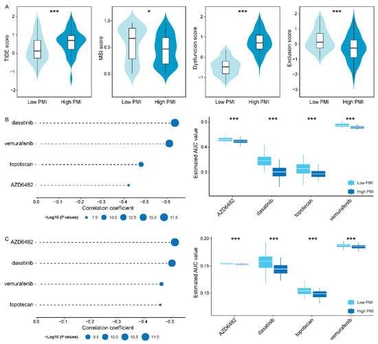 In order to seek candidate drugs with higher drug sensitivity in patients, we performed drug response prediction using CTRP- and PRISM-derived drug response data, respectively. Firstly, we screened 113 common drugs or compounds in CTRP and PRISM databases to facilitate subsequent analyses that could be corroborated with each other. Then, we performed differential drug response analysis in PMI subgroups to identify significantly different drugs or compounds, of which only lower AUC estimates in the subgroup were retained. Furthermore, we collected drugs or compounds with negative correlation coefficients using Pearson correlation analysis of AUC values and PMI scores (cor < −0.40). Ultimately, in the cross-corroboration of the two pharmacogenomics databases, we predicted four drugs or compounds (including dasatinib, vemurafenib, topotecan and AZD6482) with promising therapeutic potential in patients (Figure 6B,C and Table S7), which had lower estimated AUC values and were negatively correlated with PMI scores.