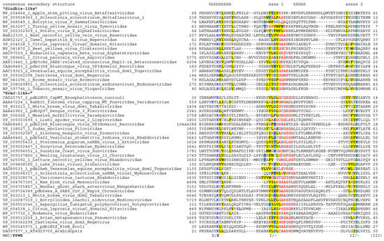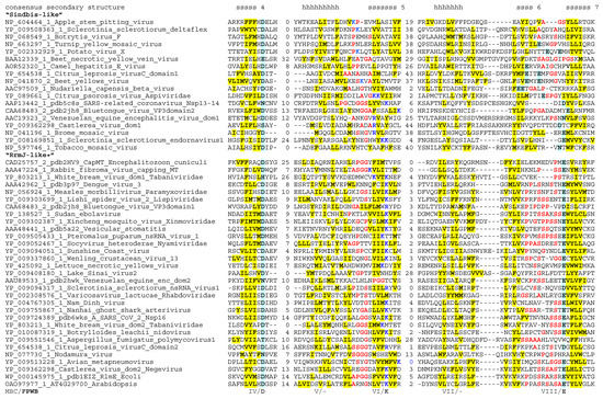 At the last step, the alignment was converted into a Hidden Markov Model, and the database of all proteins from Riboviria with completely sequenced genomes was searched with the hmmsearch program of the HMMER3 suite, with a permissive parameter set (sequence reporting threshold E-value 50, domain reporting threshold E-value 50, sequence inclusion threshold E-value 10). There were no false positives apart from the occasional Rossmann-fold helicase domains mentioned above, and additional true positive matches from virus families that have not been included into the query were added to the multiple alignment as described above. The final alignment produced after five iterations analysis is shown in Figure 1.