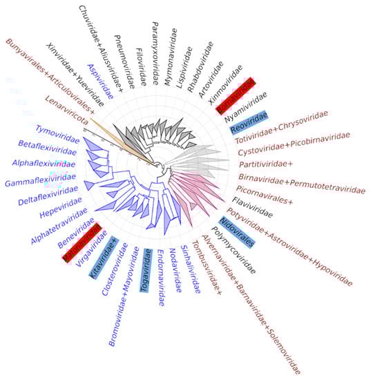 The understanding of the Riboviria phylogeny that has emerged in the last 5–10 years identifies 5 main clades of the RNA virus world (see [71,72,73] for the in-depth discussion). Those clades (called Branches in the rest of this section, following [73]) are as follows.