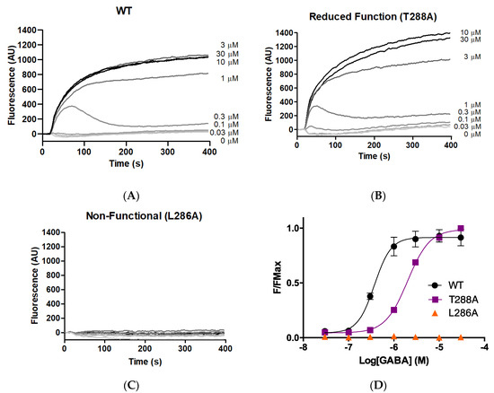 Responses of GABAAρ1R expressed in HEK293 cells. (A–C) Typical fluorescent responses (fluorescence in arbitrary units, AU) on addition of GABA (0.03–30 μM) at 20 s to cells expressing WT or mutant GABAAρR. (D) Concentration–response curves; data = mean ± SEM, n ≥ 4.
