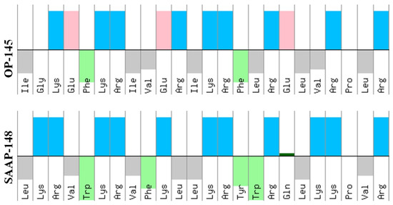 Peptide sequences. Distribution of amino acid residues in OP-145 and SAAP-148. Both peptides are N-terminally acetylated and C-terminally amidated, which is not shown in the pictures above. The hydrophilic residues are shown on top and hydrophobic on bottom as illustrated by Peptide Property Calculator (https://pepcalc.com/, accessed on 1 May 2022). Color code: acidic (red), aromatic (green), cationic (blue), aliphatic (grey), and polar (dark green).