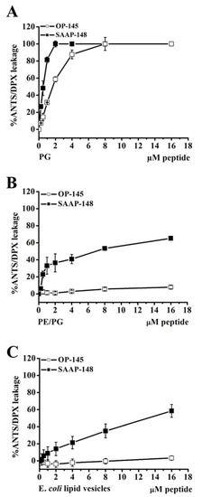 In order to examine if electrostatic interactions significantly contribute to the membrane disruption potential of the peptides, we performed membrane permeabilization assays in analogy to zeta potential measurements. Disruption of model membranes upon titration of AMPs was tested by following leakage of the fluorescent dye ANTS from LUVs composed of PG, PE/PG, and E. coli polar lipids. Figure 6 shows the highest disruption potential of the peptides for PG membranes for both peptides. Most surprisingly, OP-145 did not induce leakage of membranes having higher zwitterionic content, PE/PG, and E. coli polar lipids. A significantly lower content (~30–50%) of the latter model membranes was released upon titration to SAAP-148. The reduced ability to disrupt the E. coli polar lipid membrane, especially lacking by OP-145, indicates that no direct phospholipid–peptide interaction is responsible for some degree of transmembrane effect observed for OP-145 on the E. coli cytoplasmic membrane (Figure 4A). Because this transmembrane effect occurred after the time OP-145 requires killing E. coli, we assume that the strong surface charge neutralization of E. coli during the killing process (Figure 3), e.g., effects induced on the outer membrane contribute to the destabilization of the cytoplasmic membrane. This effect cannot be observed in simple membrane model studies composed of solely phospholipids assembled in one single membrane. In respect of a complex membrane architecture of Gram-negative bacteria, the E. coli lipid model membrane resembles the lipid composition of the E. coli cytoplasmic membrane, but not of the outer membrane.