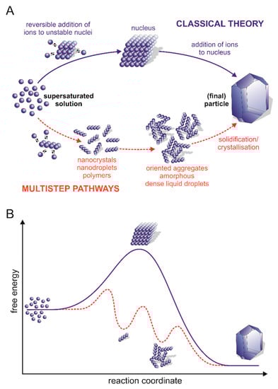 Recently, the development of advanced experimental and bioinformatics analyses has provided evidence that the formation of calcium carbonate frequently does not follow the CNT [16,17,104]. The alternative mechanisms are based on the observation of the formation of stable or metastable precursors, most likely created by the collisions and coalescence of their constituent components. These results clearly conflict with the nucleation picture presented in the CNT (Figure 2A). The presence of such individuals indicates the appearance of additional minima in the graph illustrating the Gibbs free energy of the calcium carbonate precipitation reaction (Figure 2B). This means that multistep nucleation pathways comprise more than one barrier that must be overcome, along with a number of local minima corresponding to the formation of precursors with different sizes and probably different structural arrangements [19,103,105]. In the next steps of the process, either the formation of the crystalline phase within the post-critical nucleus and subsequent crystal growth or the formation of a stable ACC may take place [16,106,107].