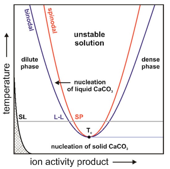 Schematic representation of the calcium carbonate phase relationships. The grey line represents an example solubility line (SL) of different polymorphs at constant temperature, the grey, checkered field corresponds to the unsaturated solution field, the L-L line represents the binodal (blue) and SP spinodal (red) lines, and Tc is the critical temperature point [120].