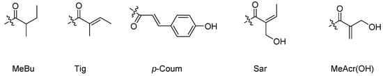 - Ren, H.C.; Zhang, J.; Liang, H. Two New p-Coumaroylated Sesquiterpenoids from Pilea Cavaleriei. J. Asian Nat. Prod. Res. 2018, 20, 109–116. [Google Scholar] [CrossRef]
