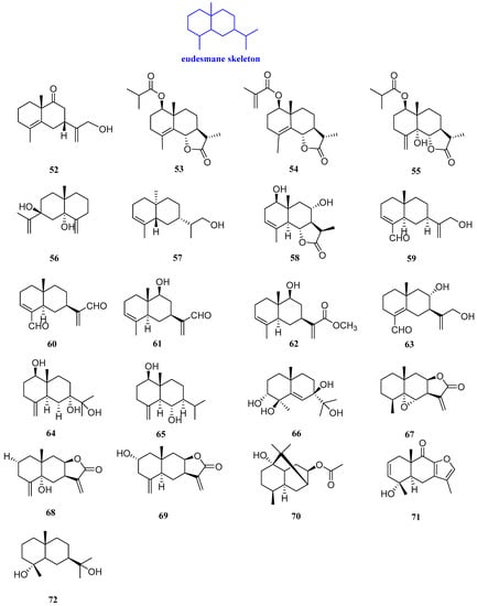 Structures of eudesmane-type sesquiterpenoids 52–72.