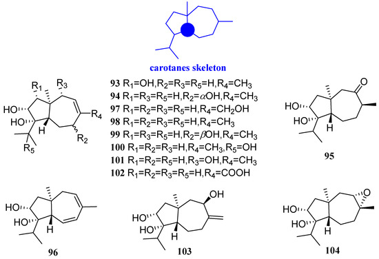 Structures of carotane-type sesquiterpenoids 93–104.