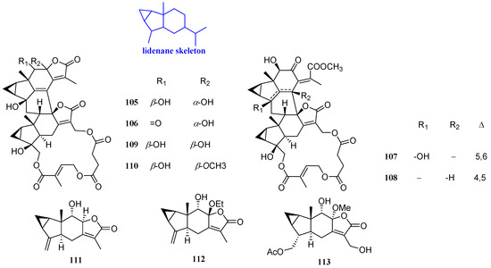 Six sesquiterpenoids, named henriol A, spicachlorantin A, chloramultilide A, shizukaol B, tianmushanol, and 8-O-methyltianmushanol (105–110, Figure 8), with antibacterial effects were isolated from the roots of Chloranthus angustifolius. Their antifungal activities were studied by microdilution method. Compounds 105–110 could inhibit the activity of C. albicans, and the MIC values were 4 to 8 µg/mL [51].