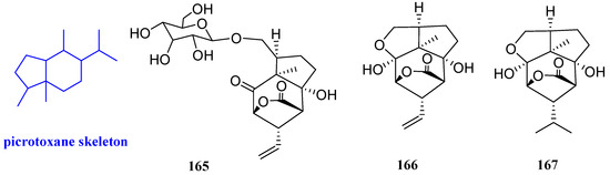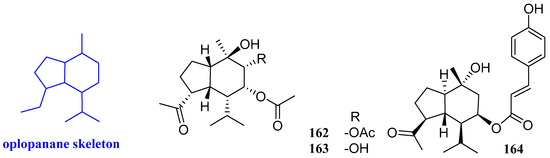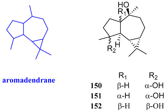 Aromadendrane-4β,10α-diol, aromadendrane-4α,10α-diol, and 1-epimer-aromadendrane-4β,10α-diol (150–152, Figure 15) were isolated from Cassia buds, the immature fruits of Cinnamomum cassia (Lauraceae), and their antibacterial activity was evaluated. Compound 151 showed selective inhibitory activities against S. aureus, with an inhibitory zone diameter of 8 mm, while it had no activity against C. albicans and E. coli. Compound 150 exhibited inhibitory effects against C. albicans, S. aureus, and E. coli, and the inhibitory zone diameters were 10, 7, and 10 mm, respectively. Compound 152 not only inhibited the proliferation of C. albicans but also inhibited the proliferation of S. aureus, with inhibitory zone diameters of 10 and 8 mm, respectively [30].