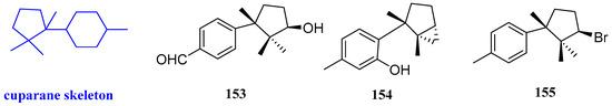 Laurencia obtusa lamouroux is a marine species with a variety of biological activities, including antioxidant, antibacterial, and so on. 10-Hydroxycuparaldehyde (153, Figure 16) from L. obtusa lamouroux had good inhibitory activity, with MIC values in the range of 0.08–0.15 mM, for E. coli, Klebsiella pneumoniae (K. pneumoniae), P. mirabilis, P. aeruginosa, E. faecalis, and S. aureus [36].