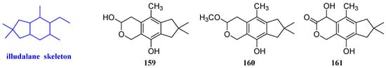 Two new sesquiterpenoids named ustusoic acid A and B (146 and 147, Figure 14) were isolated from Aspergillus ustus. These compounds had a weak inhibitory effect on vancomycin-resistant Enterococcus faecium (E. faecium) ATCC 700221 and B. subtilis ATCC 49343. Compounds 146 and 147 had a weak effect on B. subtilis ATCC 49343 and vancomycin-resistant E. faecium ATCC 700221, with MIC values ranging from 38 to 128 µg/mL, respectively [62].