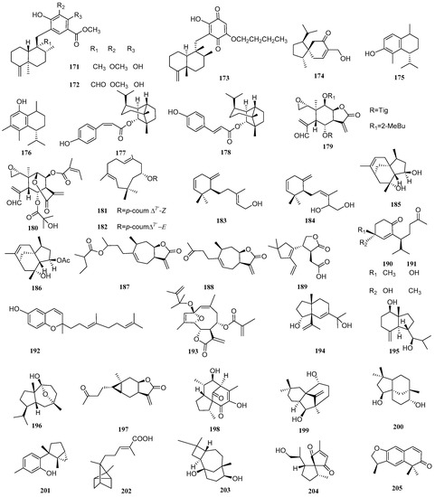 9-Hydroxynerolidol and 9-oxonerolidol (129 and 130, Figure 11), possessing chain-like structures, are two farnesane-type sesquiterpenoids isolated from Chiliadenus lopadusanus. The difference between compounds 129 and 130 is that the C-9 hydroxyl group of 129 is oxidized in 130. In the antibacterial experimental assay, 129 exhibited antibacterial activity against Acinetobacter baumannii (A. baumannii) and S. aureus, with MIC values of 150 µg/mL and 75 µg/mL, respectively. Compound 130 exhibited antibacterial activity against A. baumannii and S. aureus, with the same MIC value of 150 µg/mL [57].
