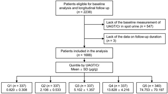 The Korean Cohort Study for Outcomes in Patients With Chronic Kidney Disease (KNOW-CKD) is a nationwide prospective cohort study involving 9 tertiary-care general hospitals in Korea (NCT01630486 at http://www.clinicaltrials.gov, accessed on 1 September 2022) [26]. Korean patients, aged between 20 and 75 years, with CKD from stage 1 to pre-dialysis stage 5, who voluntarily provided informed consent were enrolled from 2011 to 2016. The study was conducted in accordance with the principles of the Declaration of Helsinki. The study protocol was approved by the institutional review boards of participating centers, including at Seoul National University Hospital, Yonsei University Severance Hospital, Kangbuk Samsung Medical Center, Seoul St. Mary’s Hospital, Gil Hospital, Eulji General Hospital, Chonnam National University Hospital, and Busan Paik Hospital. All participants had been under close observation, and participants who experienced study outcomes were reported by each participating center. Among 2238 who were longitudinally followed up, excluding those lacking the baseline measurement of AGT or creatinine (Cr) in spot urine, and those lacking the data on follow-up duration, a total of 1688 subjects were finally included for the analyses (Figure 1). The study observation period ended on 31 March 2021. The median follow-up duration was 6.257 years.