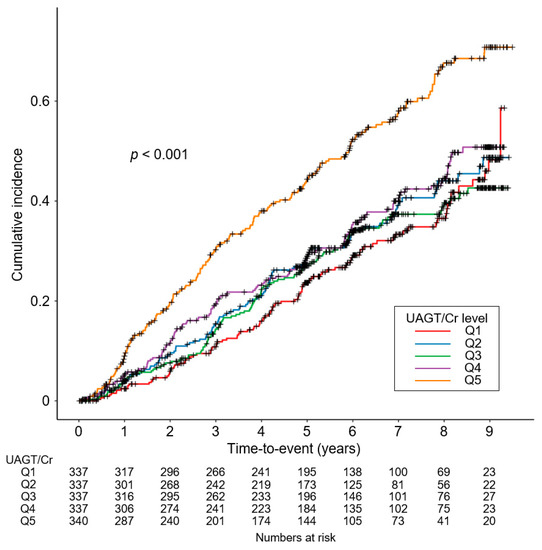 The following supporting information can be downloaded at: https://www.mdpi.com/article/10.3390/biom12091280/s1, Figure S1: Kaplan–Meier survival curve for cumulative incidence of decline in kidney function by UAGT/Cr; Figure S2: Kaplan–Meier survival curve for cumulative incidence of onset of ESRD by UAGT/Cr; Figure S3: Restricted cubic spline of UAGT/Cr on decline in kidney function; Figure S4: Restricted cubic spline of UAGT/Cr on onset of ESRD; Table S1: HRs for decline in kidney function by UAGT/Cr level; Table S2: HRs for onset of ESRD by UAGT/Cr level; Table S3: HRs for composite renal event by UAGT/Cr level after excluding the subjects at CKD stage 1; Table S4: HRs for composite renal event by UAGT/Cr level after excluding the subjects at CKD stage 5; Table S5: HRs for composite renal event by UAGT/Cr level after excluding the subjects with DM; Table S6: HRs for composite renal event by UAGT/Cr level after excluding the subjects with PKD; Table S7: HRs for composite renal event by UAGT/Cr level in the quartile division; Table S8: HRs for composite renal event by UAGT/Cr level, where the co-variate ‘serum creatinine level’ was replaced with ‘eGFR’.
