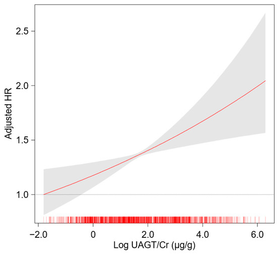To unveil the cumulative incidences of composite renal event (Figure 2), decline in kidney function (Figure S1) and onset of ESRD (Figure S2), Kaplan–Meier curves were analyzed. The risks of composite renal event (p < 0.001, by log-rank test), decline in kidney function (p = 0.025, by log-rank test) and onset of ESRD (p < 0.001, by log-rank test) were significantly different by UAGT/Cr, with the highest risk of the events in Q5. To define the independent association of UAGT/Cr level with study outcomes, Cox regression models were analyzed. The risk of a composite renal event was significantly higher in Q5 (adjusted HR 1.528, 95% CI 1.156 to 2.021) compared to that of Q1 (Table 2), suggesting that high UAGT level is associated with adverse renal outcome. Although the risk of decline in kidney function was not significantly different according to UAGT/Cr levels (Table S1), the risk of onset of ESRD (adjusted HR 1.444, 95% CI 1.050 to 1.987) was significantly higher in Q5 compared to that of Q1 (Table S2). Restricted cubic splines visualized stringent linear correlations of UAGT/Cr level with the risks of composite renal event (Figure 3). As in the Cox regression analysis, no significant linear correlation was observed between UAGT/Cr level and the risk of decline in kidney function (Figure S3), whereas UAGT/Cr level was positively correlated with the risk of onset of ESRD (Figure S4).