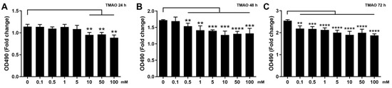 Figure 1. Effects of TMAO treatment on proliferation abilities of C2C12 myoblasts. (A) 24 h TMAO treatment. (B) 48 h TMAO treatment. and (C) 72 h TMAO treatment. Cell viabilities were used to represent the proliferation abilities of cells and assessed by MTS based on measured OD490nm values (n = 6). Statistical significances: ** p < 0.01, *** p < 0.001, **** p < 0.0001.