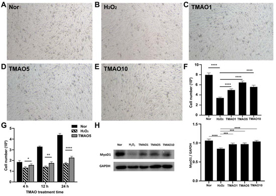 Figure 2. TMAO treatment enhanced proliferation abilities of H2O2-impaired C2C12 myoblasts. (AE) Cell morphology of normal cells, H2O2-impaired cells and H2O2-impaired cells with 24 h TMAO treatment. (F) Cell numbers of the five groups of cells analyzed by cell counting (n = 3). (G) Cell number changed with 5 mM TMAO treatment within 24 h analyzed by cell counting (n = 3). (H) Expression levels of MyoD1 in the cells analyzed by Western blot. Statistical significances: * p < 0.05, ** p < 0.01, *** p < 0.001, **** p < 0.0001.