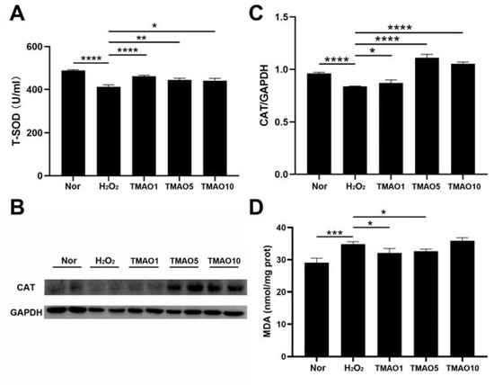 Figure 3. TMAO promotes the H2O2-induced decrease in antioxidant enzyme activity in C2C12 myoblasts. (A) Activities of T-SOD; (B) Western blot of CAT; (C) densitometry analysis of CAT expression level; and (D) levels of MDA. Statistical significances: * p < 0.05, ** p < 0.01, *** p < 0.001, **** p < 0.0001.