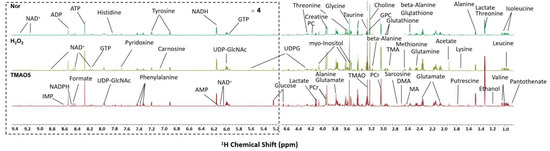 We performed the NMR-based metabolomic analysis to address the metabolic mechanisms of TMAO treatment for alleviating H2O2-induced oxidative stress damage in C2C12 cells. Figure 4 displays the typical 850 MHz 1H NMR spectra recorded on aqueous extracts derived from the normal, H2O2 and TMAO5 groups of C2C12 cells. A total of 45 metabolites were identified (Table S1). The resonance assignments of the metabolites were confirmed by using 2D 1H-13C HSQC and 1H-1H TOCSY spectra (Figures S3 and S4). The NMR spectra illustrated that the TMAO treatment led to a remarkable accumulation of intracellular TMAO (Figure S5).