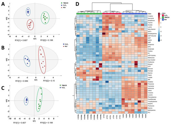 To explore the differences between the metabolic profiles of the three groups of C2C12 cells, we performed multivariate data analysis on NMR spectral data. The unsupervised PCA model with the first two principal components t[1] and t[2] was constructed to observe the trend of the overall metabolic profiles. The PCA scores plot shows distinct metabolic profiles of the three groups (Figure 5A). In addition, the metabolic profile of the H2O2 group was distinctly distinguished from the normal group along t1 (Figure 5B), and the metabolic profile of the TMAO5 group was distinctly distinguished from the H2O2 group along t[1] (Figure 5C). To further verify the reliability of the PCA model, we also carried out hierarchical cluster analysis using MetaboAnalyst 5. The hierarchical cluster analysis displayed that the normal, H2O2 and TMAO5 groups were divided into three different clusters (Figure 5D), similarly to the PCA scores plot, confirming that the PCA model was reliable.