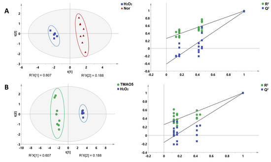 Figure 6. PLS-DA analysis for identifying significant metabolites primarily responsible for the discrimination of metabolic profiles among the three groups of C2C12 myoblasts. (A) PLS-DA scores plot of the H2O2 group vs. the normal group. (B) PLS-DA scores plot of the TMAO5 group vs. the H2O2 group. These ellipses indicate the 95% confidence limits.