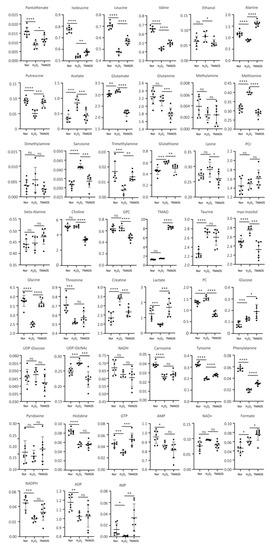 To address the changes in metabolite levels between the three groups of C2C12 cells, we calculated the relative levels of the identified metabolites based on their relative NMR integrals. We compared the metabolite levels between H2O2 and normal groups, and TMAO5 and H2O2 groups using one-way ANOVA analysis followed by Tukey’s multiple comparison test (Table 1). For the H2O2 group vs. the normal group, 31 differential metabolites were identified, including 12 increased metabolites (acetate, glutamate, methionine, sarcosine, glutathione, taurine, myo-Inositol, creatine, phosphocholine (PC), glucose, UDP-GlcNAc and formate), and 19 decreased metabolites (pantothenate, isoleucine, leucine, valine, alanine, putrescine, TMA, glycine, threonine, lactate, carnosine, tyrosine, phenylalanine, histidine, GTP, AMP, NADPH, ADP and IMP). For the TMAO5 group vs. the H2O2 group, 30 differential metabolites were identified, including 16 increased metabolites (pantothenate, isoleucine, leucine, valine, alanine, putrescine, TMA, TMAO, glycine, lactate, glucose, tyrosine, phenylalanine, GTP, formate and IMP), and 14 decreased metabolites (ethanol, acetate, glutamate, glutamine, methionine, sarcosine, glutathione, lysine, choline, sn-Glycero-3-phosphocholine (GPC), myo-Inositol, creatine, PC and UDP-GlcNAc) (Table 1 and Figure 7).