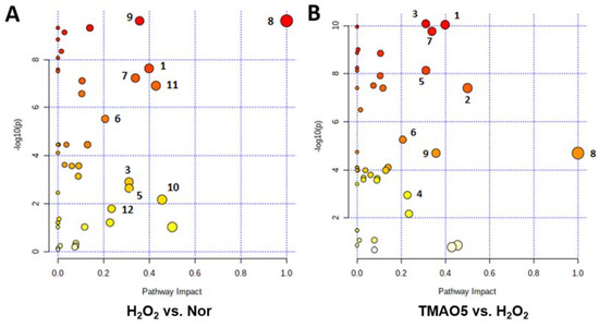 Figure 8. Significantly altered metabolic pathways identified from the pair-wise comparisons between the three groups of C2C12 myoblasts. (A) The H2O2 group vs. the normal group; (B) The TMAO5 group vs. the H2O2 group. The significantly altered metabolic pathways were identified with pathway impact values > 0.2 and p values < 0.05, which were labeled with the following numbers: (1) glutathione metabolism; (2) D-glutamine and D-glutamate metabolism; (3) alanine, aspartate and glutamate metabolism; (4) purine metabolism; (5) histidine metabolism; (6) arginine and proline metabolism; (7) glycine, serine and threonine metabolism; (8) phenylalanine, tyrosine and tryptophan biosynthesis; (9) phenylalanine metabolism; (10) beta-alanine metabolism; (11) taurine and hypotaurine metabolism; and (12) nicotinate and nicotinamide metabolism.