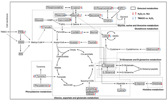 Figure 9. Schematic representation of significantly altered metabolic pathways identified from the pair-wise comparisons of H2O2 vs. normal, and TMAO5 vs. H2O2 based on the KEGG database. Dotted arrow indicate multiple biochemical reactions; solid arrows denote single biochemical reaction. The boxed metabolites and unboxed metabolites refer to detected and undetected metabolites, respectively. Abbreviations: TMAO, trimethylamine N-oxide; TMA, trimethylamine; DMA, dimethylamine; MA, methylamine; G6P, glucose-6-phosphate; 3PG, 3-phosphoglycerate; α-KG, α-ketoglutarate; GSH, reduced glutathione; GSSG; oxidized glutathione; and GPC, sn-Glycero-3-phosphocholine.