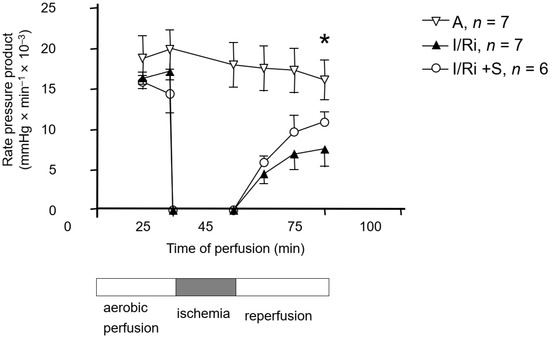 Effect of simvastatin on cardiac mechanical function after 20 min of ischemia. Result presented as the rate-pressure product (heart rate × left ventricular developed pressure) during reperfusion. Cardiac mechanical function at 30 min of reperfusion in I/R group was significantly impaired in comparison to control group but did not differ from the one of aerobically perfused hearts in simvastatin-treated group. A—aerobic perfusion, IRi—ischemia-reperfusion injury, IRi + S—hearts from IR injury model treated with simvastatin. * p < 0.05, n = 6–7, ANOVA.