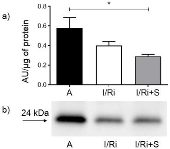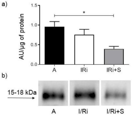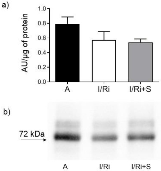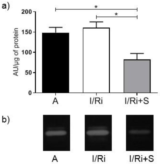 We employed gelatin zymography to determine the activity of MMP-2 in heart tissue, since MMP-2 belongs to the proteases using gelatin as a substrate. As MMP-2 is synthesized as a pro-form further converted to its active form by proteolytic cleavage of its pro-domains, MMP-2 was split into two bands: 72 and 62 kDa. In the hearts treated with simvastatin exposed to I/Ri, 72 kDa MMP-2 activity was significantly reduced compared to the I/Ri group (160.7 ± 32.07 vs. 82.48 ± 36.56, n = 5–6, p < 0.05) (Figure 2a,b). This suggests that the drug has an inhibitory effect on MMPs activation under ischemia and reperfusion conditions.
