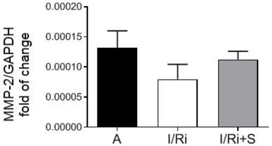 MMP-2 mRNA expression normalized to glyceraldehyde-3-phosphate dehydrogenase (GAPDH) reference gene in hearts subjected to ischemia-reperfusion. Real time PCR showed no significant changes in MMP-2 mRNA expression in heart tissue homogenates between groups. n = 5–6, ANOVA. A—aerobic perfusion, I/Ri—ischemia-reperfusion injury, I/Ri + S—hearts from IR injury model treated with simvastatin.