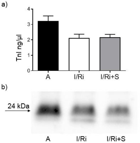 Effect of simvastatin on Troponin I content in hearts subjected to ischemia-reperfusion. (a) Analysis of Troponin I content in heart homogenates determined by Western blot. There were no significant differences in troponin I content in heart tissue. n = 5–6, ANOVA. (b) Representative blot showing the Troponin I level in heart homogenates determined by Western blot. A—aerobic perfusion, I/Ri—ischemia-reperfusion injury, I/Ri + S—hearts from IR injury model treated with simvastatin.