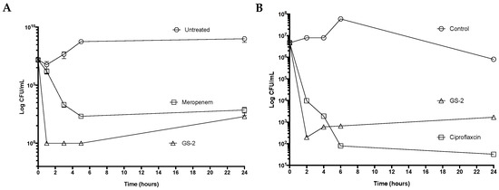 The activity of GS-2 was then tested against pathogens that cause significant disease and pose a high risk to be weaponized in circumstances such as bioterrorism. GS-2 was tested against B. thailandensis, a surrogate for B. pseudomallei that causes melioidosis, and B. anthracis, which causes anthrax. The treatment of B. thailandensis with GS-2 at 4.76 mg/mL resulted in a six-log decrease in growth and complete growth inhibition after 1 h and persisted 5 h after treatment (Figure 2A). Interestingly, GS-2 activity was superior to the antibiotic meropenem, the current first-line therapy against melioidosis, highlighting that the difference in effect between GS-2 was the time-kill effect and the antibiotic effects of meropenem. However, after 24 h, growth slightly recovered, with an average of 200 CFU/mL detected in both GS-2- and meropenem-treated samples. Testing of GS-2 against B. anthracis vegetative Sterne cells showed a rapid (four-log) decrease in growth in the first 2 h (Figure 2B). In contrast, treatment with ciprofloxacin, the first-line therapy for anthrax, resulted in a three-log reduction in B. anthracis vegetative cells.