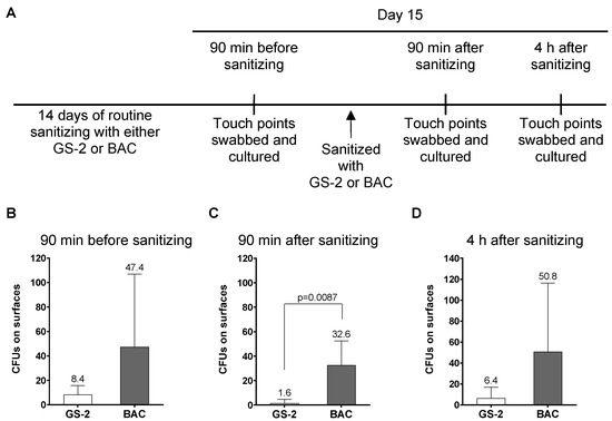 Based on the antibacterial, antifungal, and antiviral activity of GS-2, the efficacy of GS-2 on surfaces was further tested. To test the effect of GS-2 in a real-world environment, two comparative commercial buildings were sanitized for two weeks with either GS-2 (15 mg/mL) or with a commercially available hospital-grade disinfectant containing 0.42% BAC according to label instructions. After two weeks (on day 15), five high-traffic touch-points in each building were swabbed and cultured before sanitizing on day 15, 90 min after sanitizing, and 4 h after sanitizing (Figure 3A). The first swab on day 15 before final sanitizing demonstrated that the building sanitized with 0.42% BAC for the previous 14 days had, on average, 5.6-fold more CFUs on touch-points than the building sanitized with GS-2, although the differences were not statistically significant (p = 0.18; Figure 3B). Ninety minutes after sanitizing on day 15, surfaces sanitized with 0.42% BAC hospital disinfectant had, on average, 20.3 times more CFUs than the GS-2-sanitized surfaces (p = 0.0087; Figure 3C). GS-2 activity appeared to persist longer than the BAC-containing disinfectant, and 4 h after sanitizing, there was a 7.9-fold reduction in CFUs recovered from GS-2-sanitized surfaces compared to BAC-treated surfaces (p = 0.17; Figure 3D). The authors acknowledge that these results are not wholly conclusive; there are variables in a ‘real-world’ study that could potentially bias these results, such as traffic through a building on a particular day and hand hygiene between people in buildings, and this is a single study between two buildings. However, the findings demonstrate that GS-2, under the tested conditions, provided antimicrobial activity at or better than a currently approved hospital-grade disinfectant.