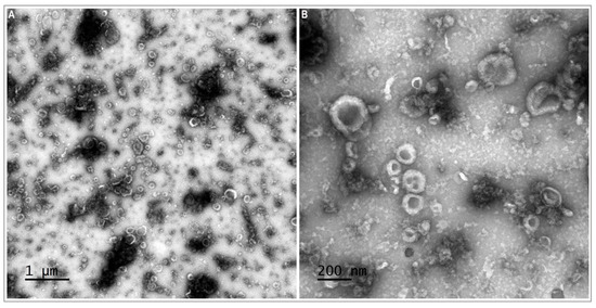 To confirm the presence of oEVs in the oviductal fluid, TEM was used as previously described by [29,40]. Briefly, a 3 µL aliquot of the vesicle suspension was placed on a Formvar–carbon-coated grid and incubated for 5 min at room temperature in a moist chamber. Samples were washed with distilled water 3 times for 10 s each time by applying a drop of ten microliters of water. After each washing, a drop of water was removed by the filter paper touching the edge of the grid; a drop of 10 µL of 4% uranyl acetate water solution was applied to the grid three times for 20 s each time. A drop of solution was removed by the filter paper touching the edge of the grid. After removing the last uranyl acetate solution drop, the grid with the sample was dried in air at room temperature. Micrographs were obtained using an Hitachi TEM (HITACHI HT 7700 Elexience, Tokyo, Japan) at 80 kV (with a charge-coupled device (CCD) camera) and the JEM 1011 (JEOL, Tokyo, Japan) TEM equipped with a Gatan digital camera driven by Digital Micrograph software (Gatan, Pleasanton, CA, USA) at 100 kV. Image processing and the analysis of the size distribution of the EV population was performed using ImageJ software (National Institutes of Health, Bethesda, Rockville, MD, USA).