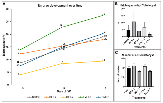 Effect of porcine oviduct extracellular vesicles (oEVs) and oviductal fluid (OF) supplementation in a sequential and non-sequential in vitro culture system on embryo development and quality over time (Mean ± SEM). (A) Graph shows blastocyst rate (%), with different letters indicating significant differences within groups at one specific time point of development (day 5–7) (p < 0.05). (B) Graph illustrates the hatching rate/blastocyst, representing the percentage of embryos that were hatching or completely hatched on day 7 of IVC/total embryos reaching the blastocyst stage on day 7. (C) Graph shows number of cells/blastocyst.