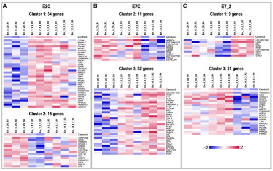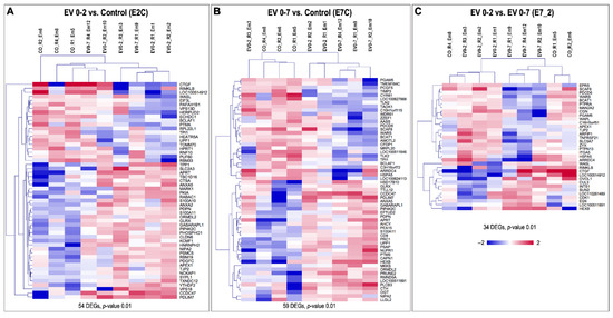 Unsupervised hierarchical clustering (HCL) of differentially expressed genes (DEGs). (A) HCL of the 54 DEGs (p-value: 0.01) confirmed a clustering of the samples according to treatment EV 0–2 vs. control (E2C). (B) HCL of the 59 DEGs (p-value: 0.01) confirmed a clustering of the samples according to treatment EV 0–7 vs. control (E2C). (C) HCL of the 34 DEGs (p-value: 0.01) confirmed a clustering of the samples according to treatment EV 0–2 vs. EV 0–7 (E7_2). HCL was performed with Pearson correlation coefficient by MeV software (Multiple Experiment Viewer, MeV v.4.8.1, https://sourceforge.net/projects/mev-tm4/, accessed on 19 May 2022) [49]. Rows indicate DEG, while columns represent embryo samples under different treatments. Mean-centered expression values (log2 counts per million of a sample − mean of log2 counts per million of all samples) for all embryo samples are shown. Color scale is from −2 (blue, lower than mean) to 2 (red, higher than mean).