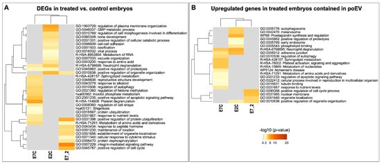 Heatmaps of overrepresented GO categories and molecular pathways of the DEGs derived from the three comparisons among embryo treatments. The heatmap cells are colored by their p-values from gray (not significant, lack of enrichment) to brown (highly significant). Image created with Metascape webtool (https://metascape.org, accessed on 19 July 2022) [44] and modified with Adobe Photoshop v.22.4.3 (Adobe, San Jose, CA, USA). (A) Heatmap of the DEGs derived from the three comparisons among embryo treatments. (B) Heatmap of the upregulated DEGs derived from the three comparisons among embryo treatments and contained in poEV.