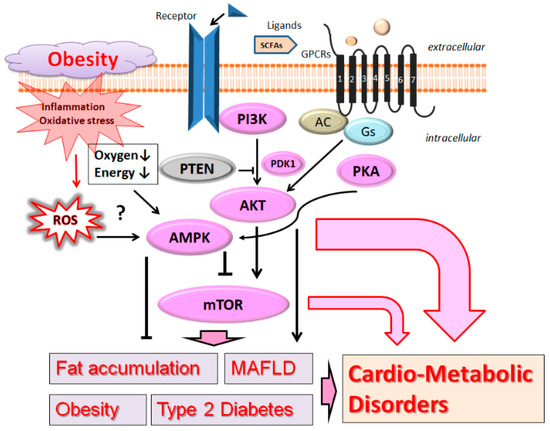 A hypothetical schematic image and overview of the pathogenesis of cardio-metabolic disorders. The PI3K/AKT/AMPK/mTOR signaling pathway might intricately contribute to the pathogenesis of obesity, type 2 diabetes mellitus, metabolic-associated fatty liver disease (MAFLD), which are all related to the pathogenesis of cardio-metabolic disorders. Arrowhead indicates stimulation, whereas hammerhead shows inhibition. Note that several important activities such as inflammatory-related reactions have been omitted for clarity. Abbreviation: MAFLD, metabolic-associated fatty liver disease; AMPK, adenosine monophosphate-activated protein kinase; mTOR, mammalian/mechanistic target of rapamycin; PI3K, phosphoinositide-3 kinase; PKA, protein kinase A; PTEN, phosphatase and tensin homologue deleted on chromosome 10; ROS, reactive oxygen species. (Numbers in black boxes: G protein-coupled receptors (GPCRs) are commonly seven-(pass)-transmembrane domain receptors).