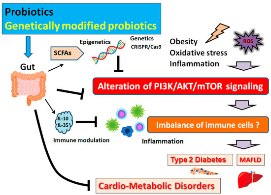 Schematic representation of the inhibition of the pathogenesis of cardio-metabolic disorders. Some types of probiotics and/or genetically modified probiotics could contribute to the alteration of gut microbial community for playing valuable roles in inhibiting the PI3K/AKT/mTOR signaling pathway in part via the epigenetics regulation with SCFAs. Examples of certain beneficial microbial species with several effects on anti-cancer immune responses are shown on the left side. Arrowhead indicates stimulation whereas hammerhead shows inhibition. Note that several important activities such as cytokine induction and/or inflammatory reactions have been omitted for clarity. Abbreviation: MAFLD, metabolic-associated fatty liver disease; mTOR, mammalian/mechanistic target of rapamycin; PI3K, phosphoinositide-3 kinase; ROS, reactive oxygen species; SCFAs, short-chain fatty acids.