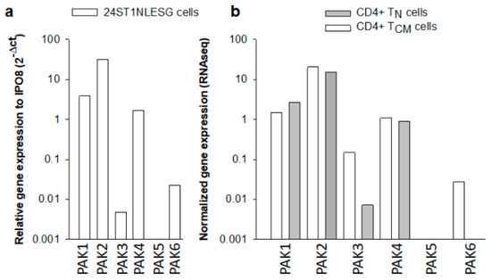 RNA expression levels of different PAK isoforms in 24ST1NLESG cells (a) and in purified naïve (TN) and central memory (TCM) CD4+ T cells. PAK RNA expression is reported relative to cellular IPO8 expression. Data in Figure 2a represent the mean from two independent experiments. Data in (b) are from a single RNAseq experiment.
