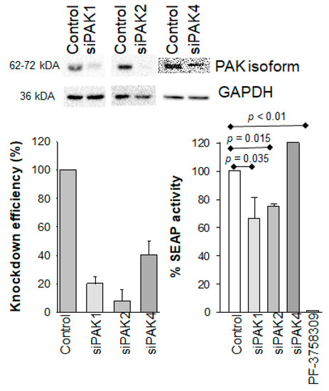 The following supporting information can be downloaded at: https://www.mdpi.com/article/10.3390/biom13010100/s1, Figure S1: Drug/protein binding analysis of PF-3758309-treated peripheral blood mononuclear cells; Figure S2: Original Western blot data; Table S1: Primer sequences used for qPCR analysis of PAK isoform expression.