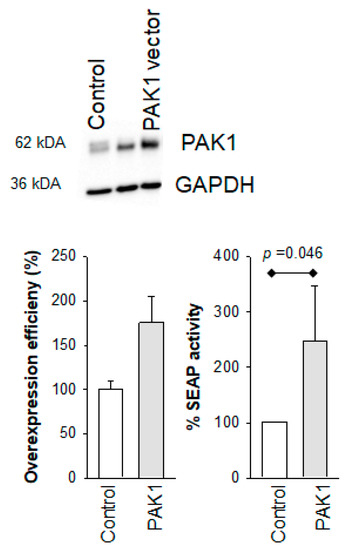 To further delineate the roles of PAK1 and PAK2 in the maintenance of HIV-1 latency, we overexpressed these isoforms in 24ST1NLESG cells (Figure 4). Cells were harvested 120 h post-transfection to assess overexpression by Western blot analysis. Compared to the control experiment, which included cells transformed with an empty vector, we observed notable overexpression of PAK1 in the in 24ST1NLESG cells (Figure 4(a,b)). By contrast, we could not assess PAK2 overexpression due to the experimental difficulty in purifying high plasmid yields in bacteria, as reported previously [18,19]. Overexpression of PAK1 in 24ST1NLESG cells resulted in a statistically significant increase in SEAP expression (Figure 4(c)), providing additional evidence that this isoform contributes to the maintenance of HIV-1 latency.