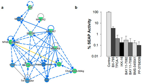 PAKs act as key signal transducers in several signaling pathways, including Ras, Raf, NF-κB, Akt, Bad, and p53 [9]. Protein phosphorylation plays an important role in cell signaling. Accordingly, we used the Phospho Explorer Antibody Array (Full Moon Biosystems) to quantitate broad-scope phosphorylation profiling changes in 24ST1NLESG cells exposed to 8 nM PF-3758309 or DMSO (control) for 24 h to try to better understand how inhibition of PAKs by PF-3758309 controls HIV-1 latency. The Phospho Explorer Antibody Array conducts phosphorylation profiling with 1318 site-specific antibodies from over 30 signaling pathways. In our data analysis plan, we only considered phosphorylation changes that exhibited fold changes in phosphorylation that were >1.4 and <0.6 between control and PF-3758309 treated cells. In total, we identified 47 proteins that exhibited site-specific increased phosphorylation and 14 proteins that exhibited site-specific decreased phosphorylation in PF-3758309 treated cells, respectively (Table 1). Next, we used the Ingenuity® Pathway Analysis to identify which signaling pathways were regulated by PF-3758309 (Figure 5a). This analysis revealed down-regulation of the NF-κB pathway (p-value 2.8 × 10−24), which is consistent with prior studies demonstrating that PF-3758309 suppressed NF-κB signaling in lung cancer cells [8,20]. Importantly, multiple studies have demonstrated that both the canonical and non-canonical NF-κB signaling pathways drive HIV-1 proviral expression [21]. To further evaluate the role of NF-κB signaling in the reversal of HIV-1 latency mediated by TNF-α in 24ST1NLESG cells, we treated cells with 2 µM of 6 different NF-κB inhibitors and then assessed SEAP activity (Figure 5b). None of the inhibitors elicited cellular cytotoxicity at the concentration used. All of the NF-κB inhibitors blocked reactivation of latent HIV-1 to the same extent as PF-3758309. As such, down-regulation of the NF-κB pathway by PF-3758309 provides the most likely mechanism by which the drug inhibits latency reversal.