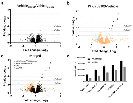 Drug/protein binding analysis of PF-3758309-treated 24ST1NLESG cells. Volcano plots for (a) two identical vehicle groups (decoy comparison), (b) PF-3758309 and vehicle groups (experimental comparison), and (c) the decoy and experimental comparisons merged. The x-axis indicates the relative fold change (log2-transformed expression values of peptides in the absence or presence of PF-3758309) and the y-axis indicates the –log10 of the p values. (d) Bar graph illustrating enrichment of PKA and MAPK1 peptides in 24ST1NLESG cell lysates treated with PF-3758309. Bar graph data are shown as the mean ± standard error.