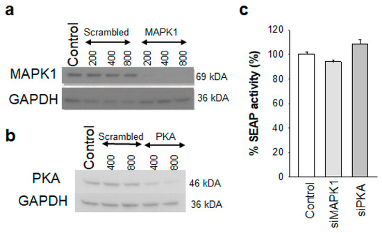 Next, we used siRNA to knock down expression of MAPK1 and PKA in 24ST1NLESG cells (Figure 7). The magnitude of the siRNA-mediated gene silencing was confirmed 120 h post-siRNA transfection by Western blot analysis (Figure 7a,b). However, knockdown of MAPK1 and PKA did not impact HIV-1 latency reversal in 24ST1NLESG cells (Figure 7c), suggesting that off-target binding of PF-3758309 to these proteins does not contribute to the activity of the drug.